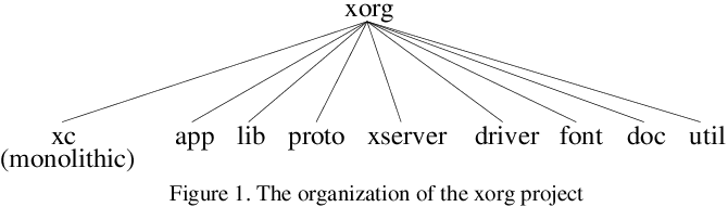 From the Figure above, the monolithic source tree will continue in the xc hierarchy within the xorg project. Along side of it will be several separate modules: app, lib, proto, xserver, driver, font, doc, and util. Each of these modules will be detailed below. Not shown in Figure 1 are the extras, which will exist outside of the source tree and contain only those source tarballs required to build the tree, but for which xorg is not the canonical source repository.