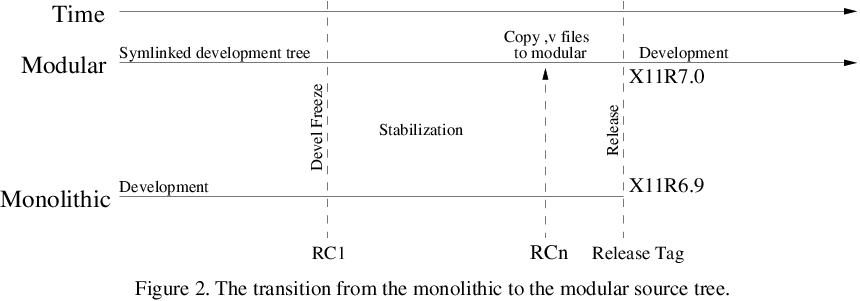 When both releases are ready (Release Tag in Figure 2), the monolithic tree will be tagged with XORG-6_9_0 and the modular tree will be tagged with XORG-7_0_0. In addition, the 6.9 and 7.0 branches will created in their respective trees.